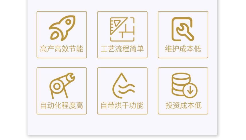 優(yōu)勢特點:、高產(chǎn)高效節(jié)能、工藝流程簡單、維護成本低、自動化程度高、自帶烘干功能、綜合投資成本低